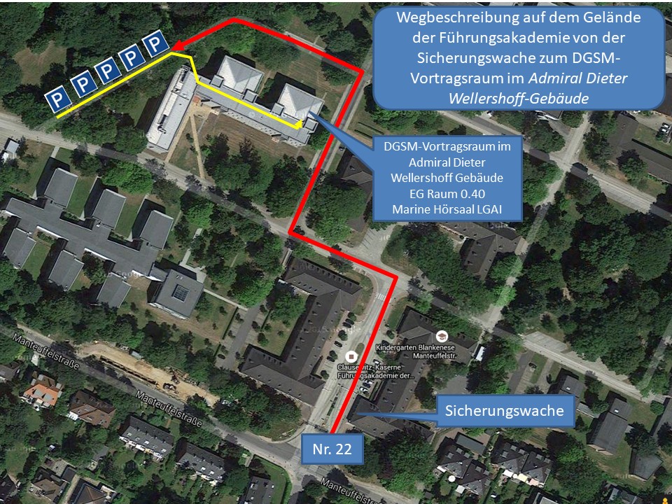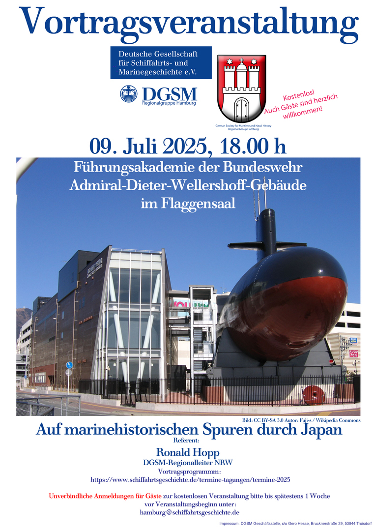 Dieser Vortrag der DGSM Hamburg findet in der Führungsakademie der Bundeswehr, Manteuffelstraße 20, 22587 Hamburg, Admiral-Dieter-Wellershoff-Gebäude statt. Mitglieder und Gäste sind zu dieser kostenlosen Veranstaltung herzlich eingeladen. Gäste müssen sich beim Hamburger Regionalleiter ca. 1 Woche vorher unter hamburg(at)schiffahrtgeschichte.de anmelden. Das Anmelden verpflichtet dabei NICHT zwingend zur Teilnahme - es geht lediglich darum, dass ein Sicherheitsbereich betreten wird, für den der Regionalleiter die Teilnehmer rechtzeitig vorher anmelden muss.