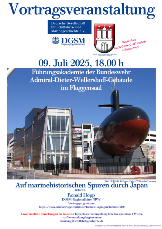 Am 09.07.25 um 18 h besucht der DGSM-Regionalleiter von Nordrhein-Westfalen, Herr Ronald Hopp die DGSM Hamburg in der Führungsakademie der Bundeswehr Hamburg und berichtet von seiner Japan-Reise, die er durch seine marinehistorische Brille betrachtet. So wird er mehrere Stationen der Reise beleuchten und z.B. über das japanische Schlachtschiff Yamato und seine Darstellung in japanischen Museen berichten.