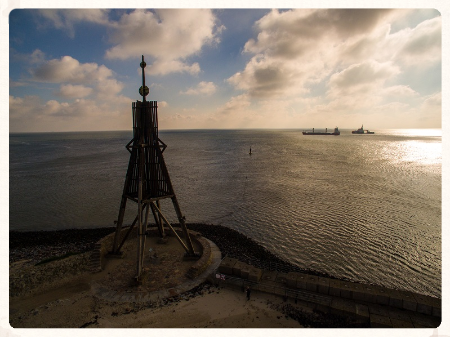 Die Kugelbake (oben im Bild) ist ein 28m m hohes aus Holz errichtetes Seezeichen in Cuxhaven an der Elbmündung. Seit 1703 steht in Cuxhaven eine Bake aus Holz, die fast alle 30 Jahre erneuert oder instandgesetzt werden musste. 1853 enthielt sie sogar ein Leuchtfeuer zur nächtlichen Orientierung der Seefahrt. Die Kugelbake verlor nach der Inbetriebnahme von Feuerschiffen ihre Bedeutung als Seezeichen. Die heutige Konstruktion stammt aus dem Jahr 1945. Im Bildhintergrund sind ein Frachter sowie das Mehrzweckschiff "Neuwerk" zu sehen.